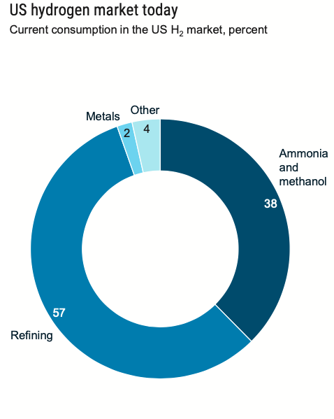 Hydrogen today is primarily used as a feedstock in industrial processes like ammonia synthesis and the refining of crude oil (see chart for exact breakdown). But, hydrogen is gaining momentum as a key catalyst in decarbonizing a range of sectors, including long-haul transport, chemical production, and iron and steel production.