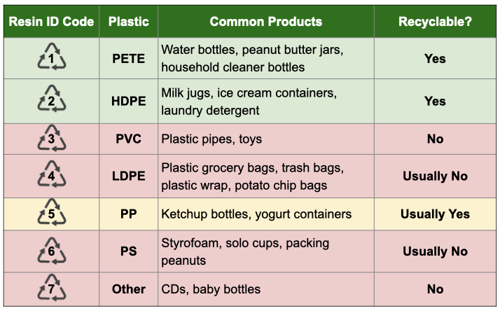 - Adopt better recycling habits. Always recycle alumnium, steel, #1/#2 plastics, cardboard, and newspapers assuming they are not contaminated. For other plastics, see this table below as a helpful reference, though it's recommended that you take a look at your local guidelines periodically as recommendations may change